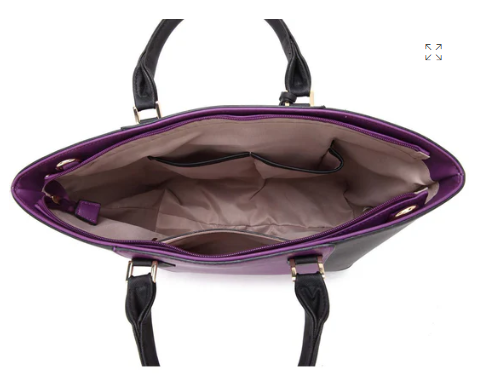 Design: Women fashion two tone tote bags with matching wallet with a fashion tassle. Top zip closure, gold hardware and bottom studs.