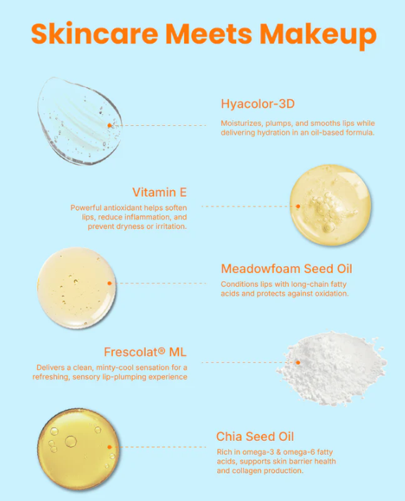 This gloss is infused with skincare-inspired ingredients like Vitamin E, Meadowfoam Seed Oil, Chia Seed Oil, and Hyaluronic Acid to help hydrate, soften, and visibly plump the lips. A gentle minty-cool sensation creates a refreshing feel without any uncomfortable heat or stinging.
