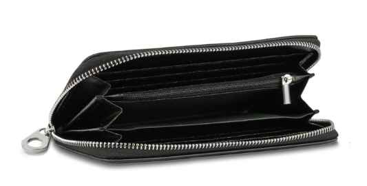 Interior zip divider pocket, multiple currency slots and multiple card slots.